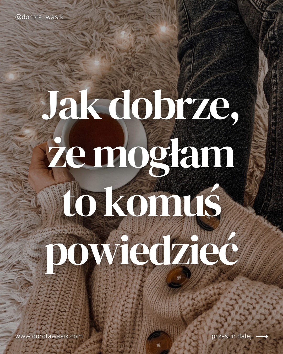 Dopiero wtedy zobaczysz, że choć nic Ci w życiu nie zostało, straciłaś pracę, przyjaciół, partnera, pieniądze czy zdrowie, One wciąż tutaj są. Zamiecione pod dywan, zakurzone, porzucone. Czekają, aż weźmiesz je do rąk, popatrzysz na nie i powiesz im: TAK. JESTEM GOTOWA.